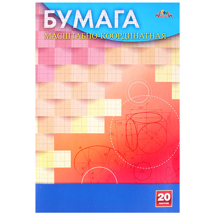 Бумага масштабно-координатная, 20 листов в папке, формат А4, плотность 65 гр/м2. Внутренний блок - офсетная бумага с точной миллиметровой разметкой, линовка оранжевого цвета. Упаковка - папка из мелованного картона с одним клапаном.
