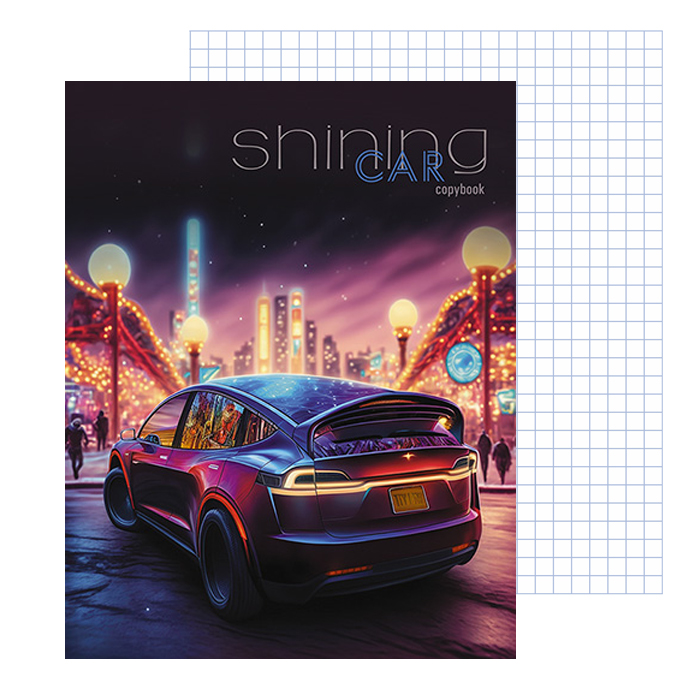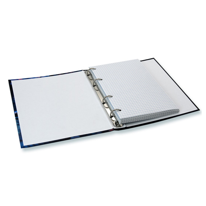 Бумага внутреннего блока бела, линовка – клетка голубого цвета. Листы блока соединены кольцевым механизмом из 4-х колец.