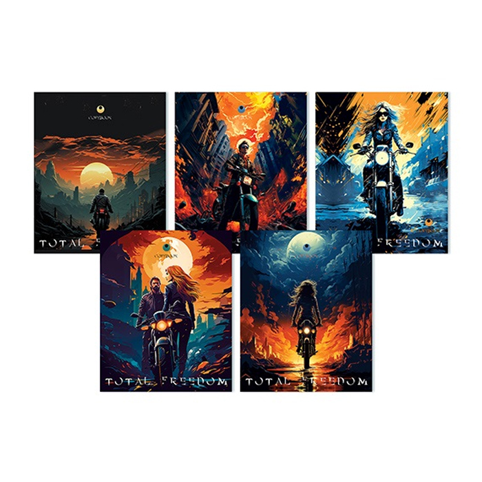 5 дизайнов в серии. Общая тетрадь 48 листов, клетка. Формат А5. (202 х 165 мм). Внутренний блок - высокачественная, белая, офсетная бумага. Плотность 60 гр/м2. Блок - голубая клетка - 5 х 5 мм, поля красного цвета. Обложка - мелованный картон, полноцветная печать, с разноцветными блёстками. Блок и обложка скреплены металлическими скобами.