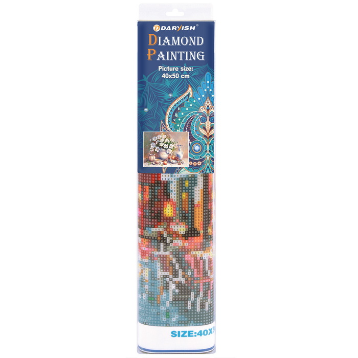 Алмазная живопись "Darvish" 40*50см. В комплекте: холст 40*50см на липкой основе с защитной плёнкой., стразы.,пластиковая ручка.,поддончик.,силиконовый клей.,пакет. Упаковка - блистер на европодвесе 8*43*4см. Азмазная живопись станет отличным подарком, поможет освоить новый вид творчества.Создание картины из страз способствует снятию нервного напряжения, поднятию настроения , а также активизации мышления, улучшения внимания и терпения. Готовая картина украсит интерьер или станет отличным подарком для близкого человека.