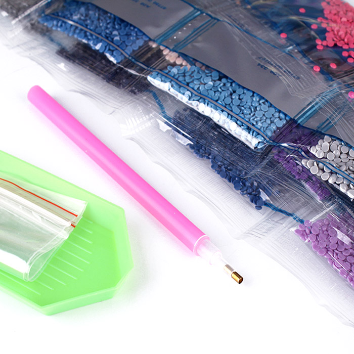 В комплекте: деревянный подрамник и холст 40*50см на липкой основе с защитной плёнкой, разноцветные стразы, пластиковая ручка, пластиковая ёмкость "поддон", гелеобразный клей (в форме прямоугольной пластины), пакет. Упаковка - картонная коробка 51*41*2,5см.