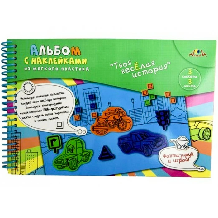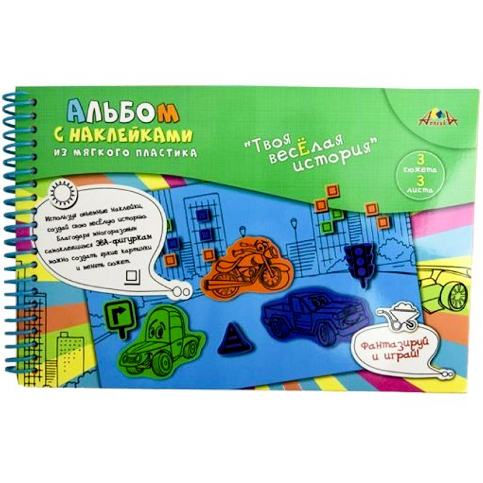 Набор для творчества. Альбом с наклейками из мягкого пластика "Твоя веселая история". размер 18 х 27 см. В альбоме 3 листа мягкого пластика, на которых напечатаны сюжеты и 3 листа с фигурными наклейками. Приклеивая наклейки на рисунок ребенок создает свою веселую историю. Обложка из мелованного картона с полноцветной печатью. Крепление листов - цветная пластиковая спираль. Упаковка - ПЭТ пакет с европодвесом.