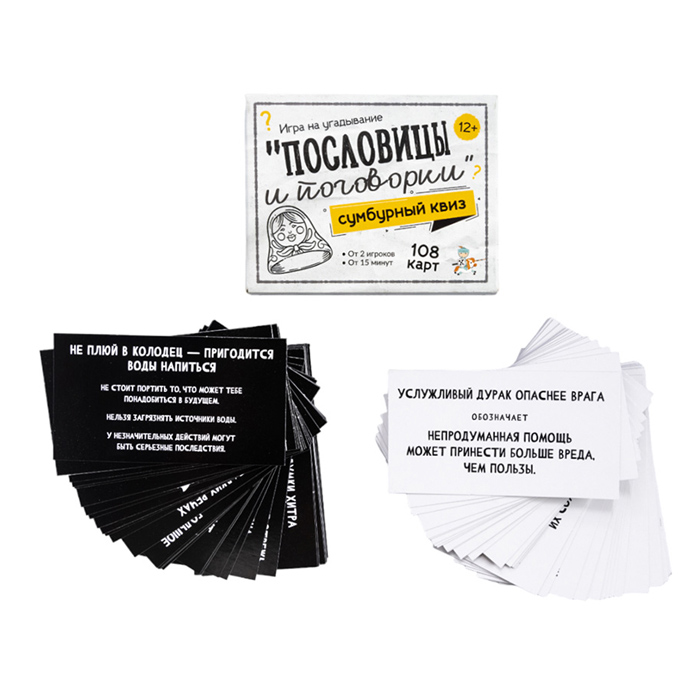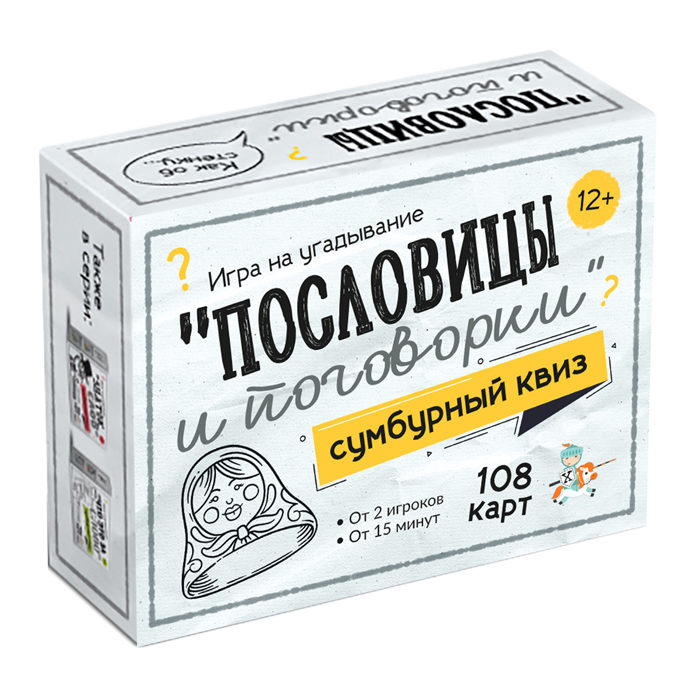 Настольная игра для большой компании "Сумбурный квиз. Пословицы и поговорки" - это интеллектуально-развлекательная игра, в которой проверяется знание пословиц и поговорок, и их значения.