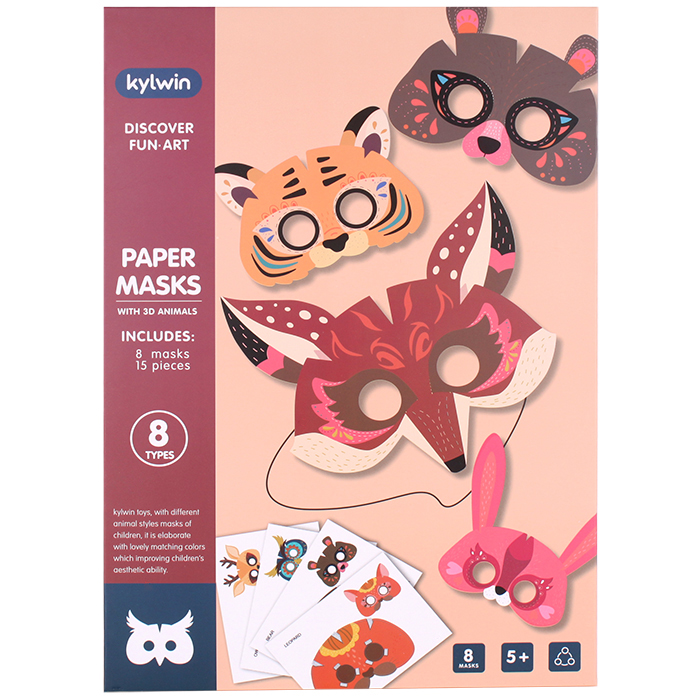 Набор для творчества "Маска 3D" животные. Комплектность 8 бумажных масок (15листов с изображением), резинка эластичная , стикеры 1 лист, инструкция.
