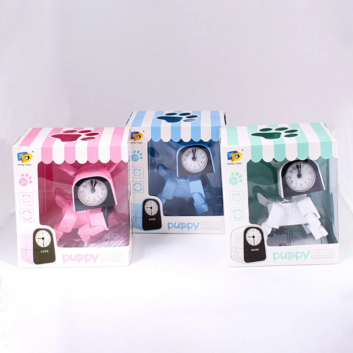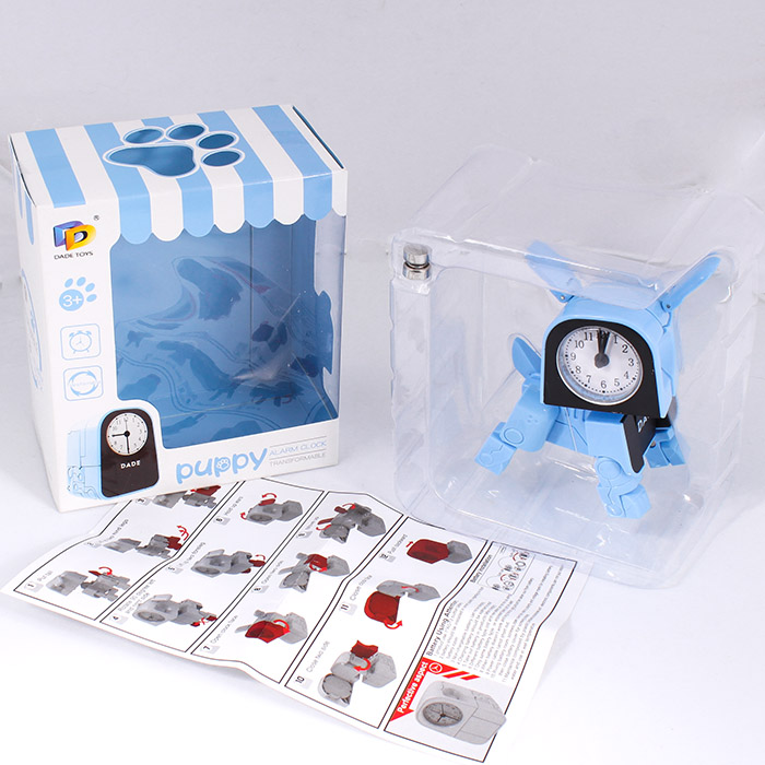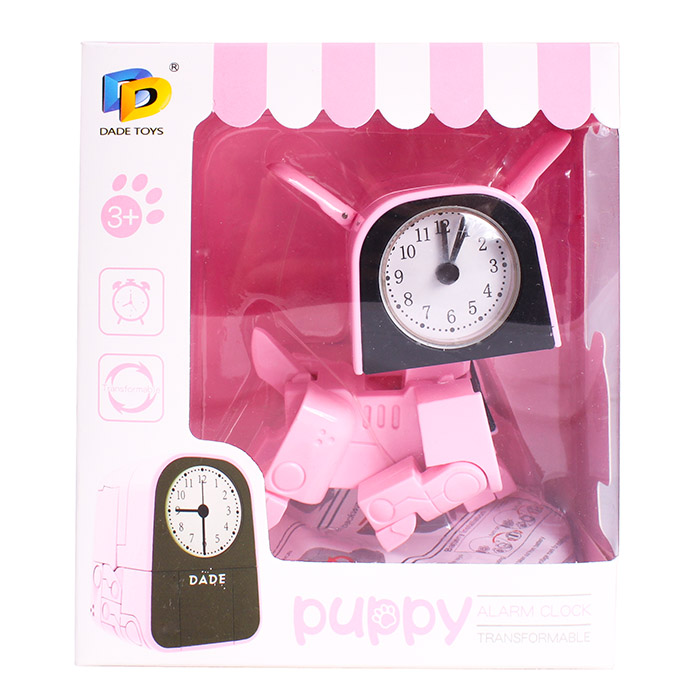 Трансформер Щенок - часы. Выполняет функцию игрушки - Щенка, который трансформируется в часики-будильник. Использовать батареи LR44*2шт( в комплект входят). Упаковка - картонная коробка 13*15*8 см.