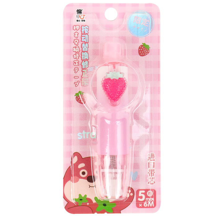 Корректирующая лента "Клубничка". Размер : ширина-5мм , длина-6м. Обеспечивает устойчивое покрытие на любой бумаге , не требуя повторного нанесения. Быстрая и чистая правка письма. Упаковка -блистер с европодвесом. 7,5*16*4см