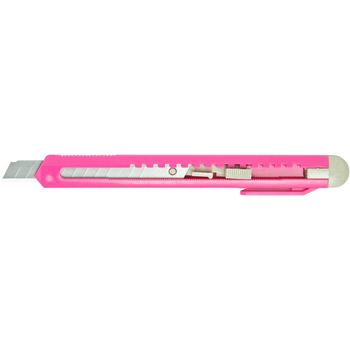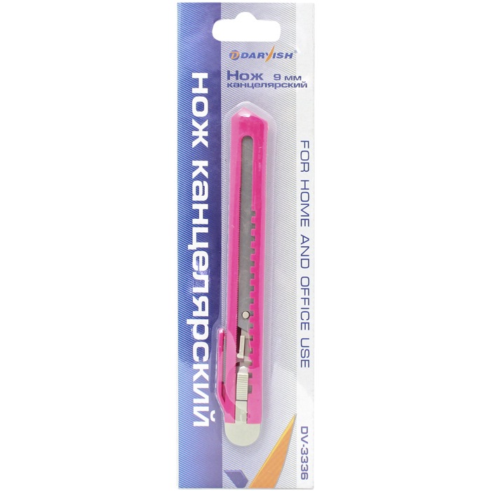 Нож канцелярский 9мм . Цвета в ассортименте. Упаковка : п/э пакет с европодвесом. Размер :3,5*17,5*0,5см