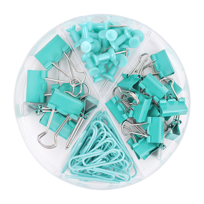 Комплектность: зажимы 15мм, зажимы 19мм , скрепки , силовые кнопки. Цвет: мятный. Упаковка : пласт. кор. 10*2,5*10 см