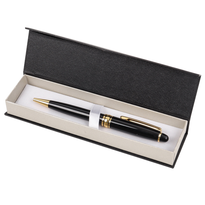 Ручка подар. корпус черный с золотистой отделкой в футляре . Ручка с поворотным механизмом. Стержень шариковый объёмный метал. 98мм. Упаковка: картон. Размер :17,5*2,3*4,5см