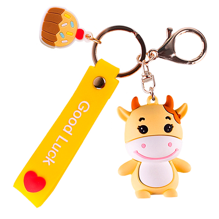 Брелок "Бычок" (5*3,5см ) с карабином и силиконовым ремешком с надписью"GoodLuck" и насадками. Асcорти цвет (желтый и розовый). Упаковка - п/э.