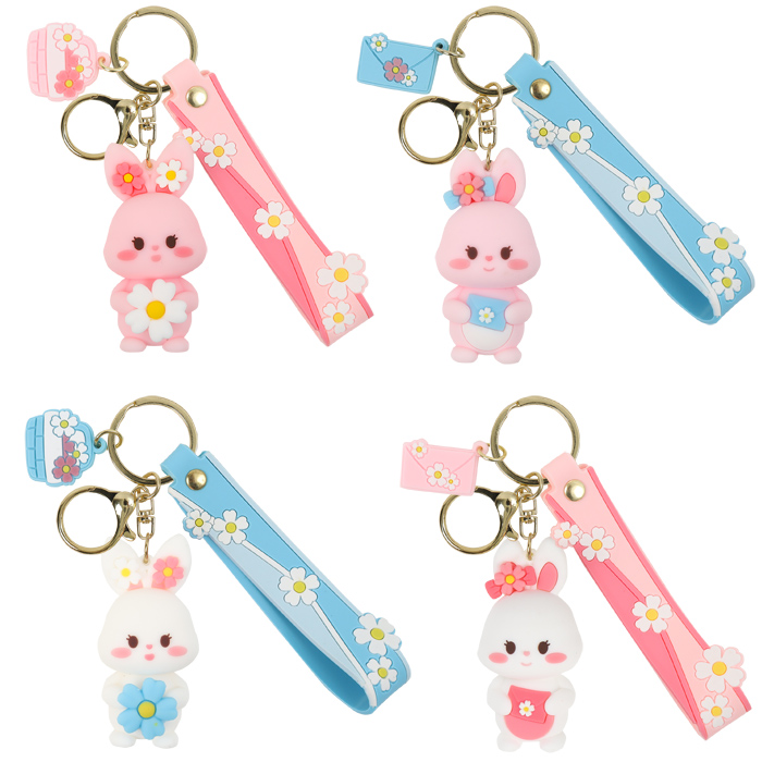 Брелок "Зайчик" 3*7*2см ассорти. Изготовлен из полимерных материалов с элементами из металла. Дополнительно на кольце силиконовый ремешок с принтом и карабин.