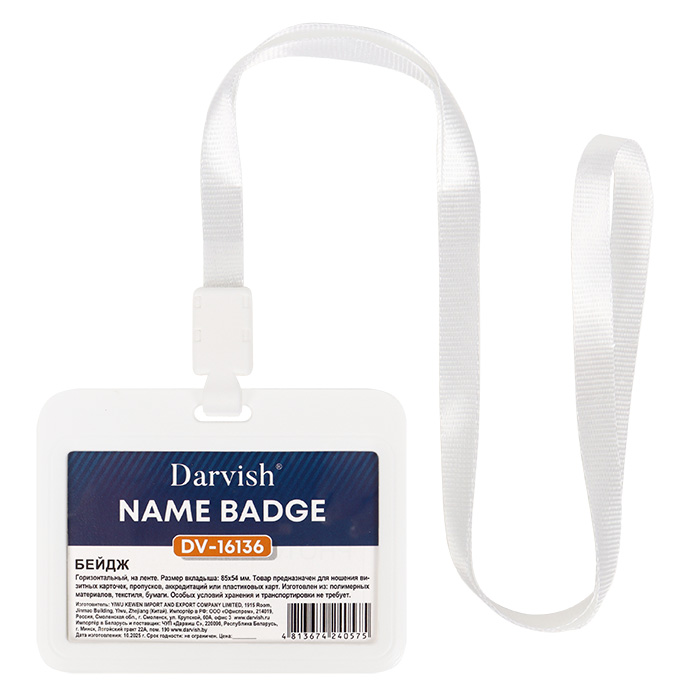 Бейдж на ленте горизонтальный. Размер вкладыша: 85*54 мм. Предназначен для ношения визитных карточек, пропусков, аккредитаций или пластиковых карт. Упаковка 12шт-пакет.