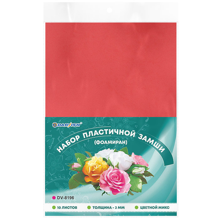 Пластичная замша (или фоамиран) - синтетический материал с пористой и бархатистой структурой. Пластичный и лёгкий в работе материал для создания и декорирования цветов, игрушек, открыток, альбомов, фоторамок, подарочной упаковки и реализации любых творческих идей. В набор входят: 10 разноцветных листов толщиной 2 мм. Размер листов: А4 (210х297 мм). Упаковка: п/э пакет с европодвесом.