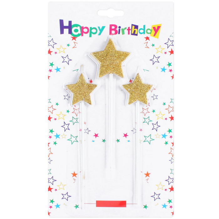 Набор свечей "Звездочки" 3шт, высота - 13см. Такой красивый набор свечей для торта станет отличным украшением для праздничного торта,кексов или пирожных! Цвет - золото или серебро. Упаковка-блистер с европодвесом.