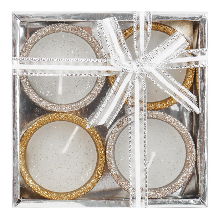 Свечи в наборе 4шт круглые серебро/золото . Размер свечи 4,5*4,5*2см. Упаковка подарочный блистер с бантиком 10,5*10,5*2,8см.