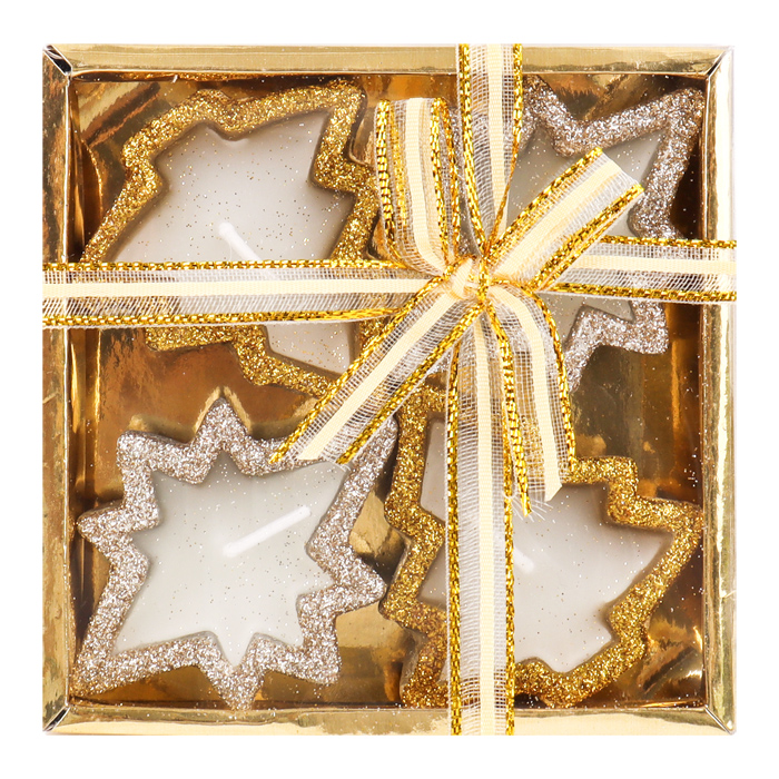 Свечи в наборе 4шт ёлочки ассорти. Размер свечи 5*5,5*2см. Упаковка подарочный блистер с бантиком 10,5*10,5*3см.