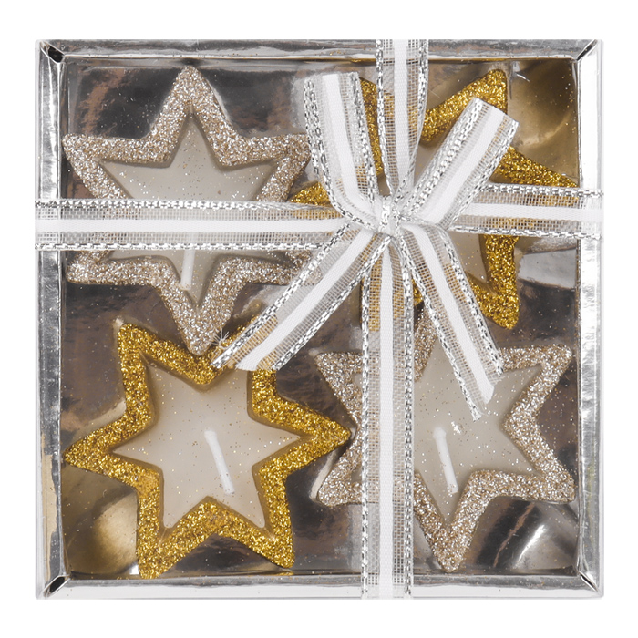 Свечи в наборе 4шт звездочки ассорти. Размер свечи 5*5*2см. Упаковка подарочный блистер с бантиком 10,5*10,5*3см.