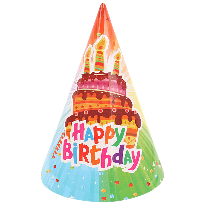 Праздничное украшение "Колпачок" h-15,5см 6шт/уп (набор) ассорти. В наборе 6 бумажных колпачков с надписью HappyBirthday на резинке. Высота 15,5см. Упаковка п/э 21*27,5*0,2см.