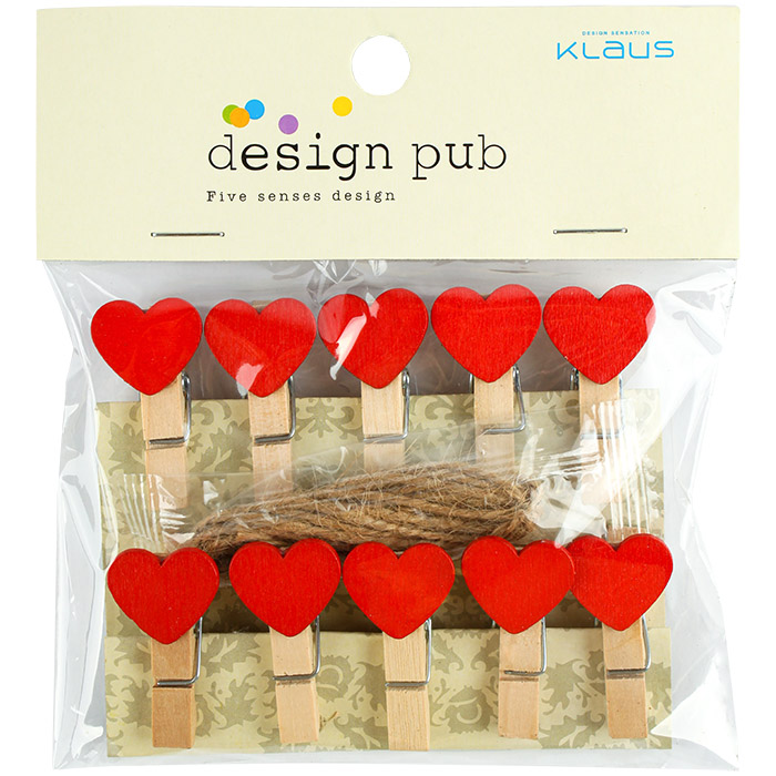 Прищепки декоративные деревянные "Сердечко" 10шт/уп + шпагат 1,40 см (набор). Прищепка h3.5 см.Размер упаковки 12*13,5см. Европодвес