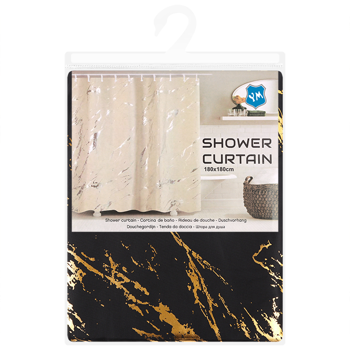 Шторка для ванной с кольцами 180*180см ассорти. Комплектность: шторка, кольца (12шт). Цвет: бежевый с золотом, бежевый с серебром, черный с золотом, черный с серебром. Упаковка: пакет 24,5*32*2см.