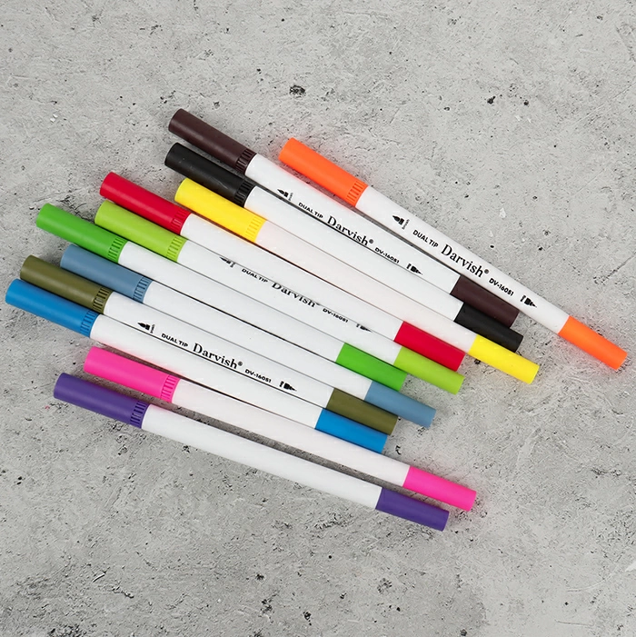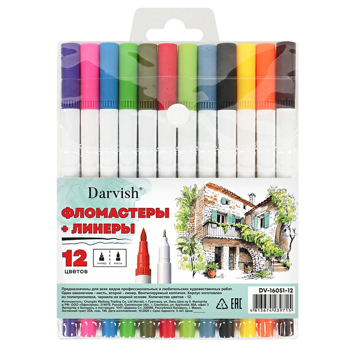 Предназначены для всех видов профессиональных и любительских художественных работ. Один наконечник -кисть, второй-линер.Чернила на водной основе. 12 цветов. Упаковка: ПВХ-футляр на кнопке с европодвесом. 13,5*19,5*1,5см