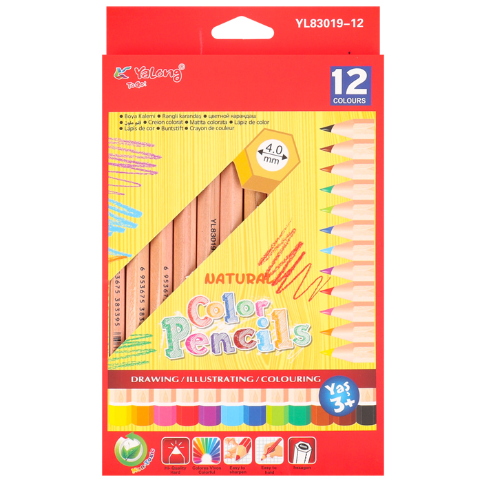 Предназначены для рисования на бумаге и картоне. Количество цветов : 12. Шестигранный корпус из древесины. Упаковка: картонная коробка с европодвесом 12*20,3*1