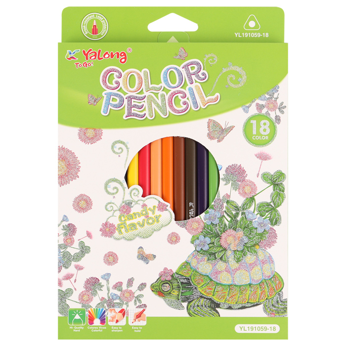 Предназначены для рисования на бумаге и картоне. Количество цветов : 18. Трёхгранный корпус из пластика. Упаковка 8шт: плёнка.15*38*5см