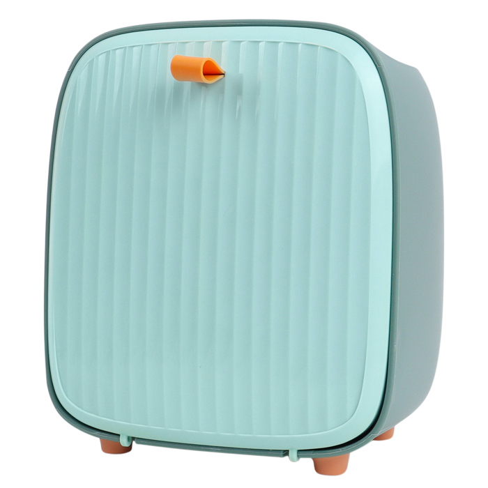 Пластиковый контейнер для мусора с передним открыванием. Размер 17*20*11см. Подходит для размещения в спальне, кухне и ванной комнаты, на рабочем столе. На поверхности имеется держатель для мобильного телефона. Упаковка картонная коробка 18*20,5*14см.