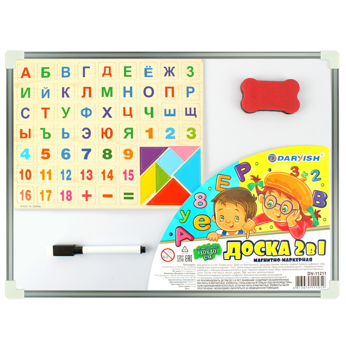 Доска магнитно-маркерная 30*40 см (буквы, цифры, геометрические фигуры). Деревянный алфавит, цифры, знаки помогает развивать ребенка. Занимаясь с ним, Вы произносите звуки, показываете буквы, цифры и даёте их в руки ребенку. Когда он слышит звуки, видит фигуры и может их потрогать, задействовано сразу три органа чувств: зрение, слух и осязание. Такой подход поможет быстрее запомнить буквы, ведь чем ярче впечатление, тем лучше они запоминаются. Упаковка : пленка.