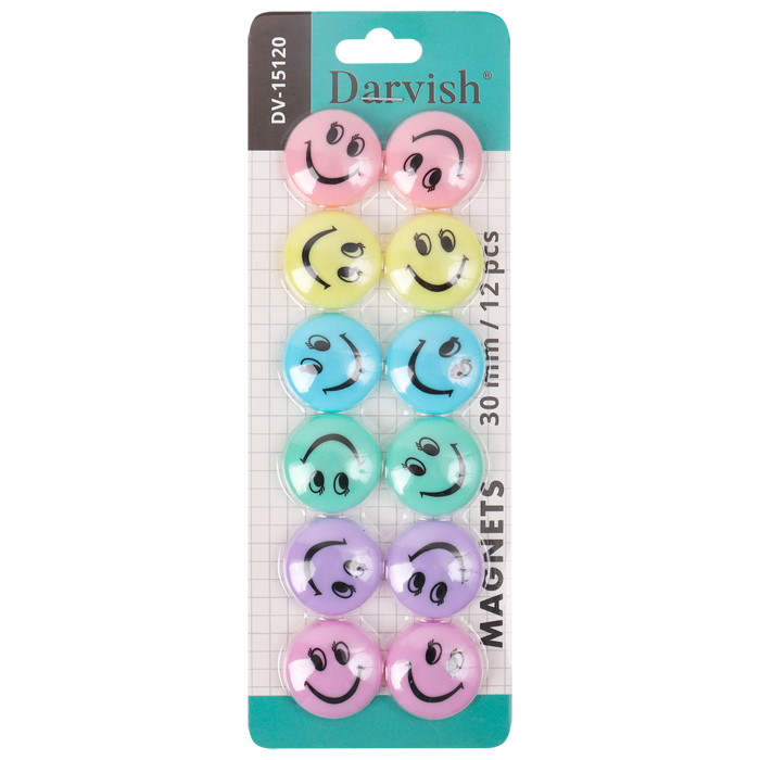 Магниты для доски цветные пастельные оттенки "Смайлики": круглая форма, диаметр 30мм, в наборе 12 шт. Упаковка-блистер 7,5*21,5*1см.