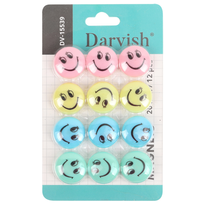 Магниты для доски цветные "Смайлики" d=2см "Darvish" 12шт/уп. Упаковка - карт.блистер с европодвесом. 7,5*12,5*1см