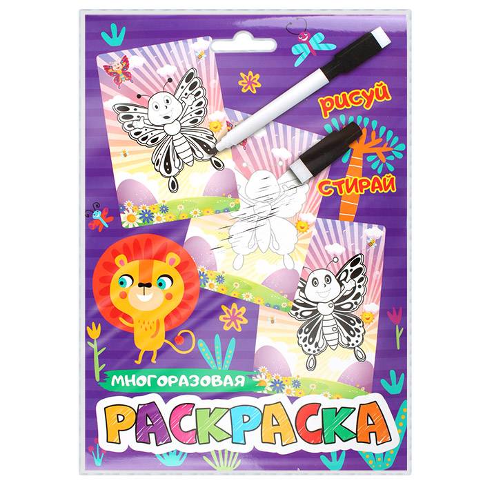 Для детей старше 3-х лет. Комплектность: 3 двусторонних вкладыша, маркер. Размер: А5. Материалы: картон, пластик, чернила на водной основе. Для повторного использования нужно всего лишь стереть рисунок губкой на маркере или влажной салфеткой. Упаковка: п/э с европодвсом 15*21*1см