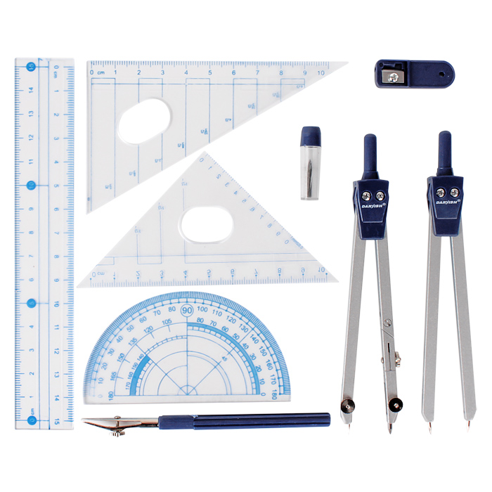 Готовальня 9 предм. "Darvish" .В набор входит: циркуль, циркуль-измеритель , рейсфедер ,контейнер с запасными грифелями для циркуля , точилка , 2треугольника , линейка , транспортир. Упаковка - пласт. пенал с европодвесом.10,5*22*2см